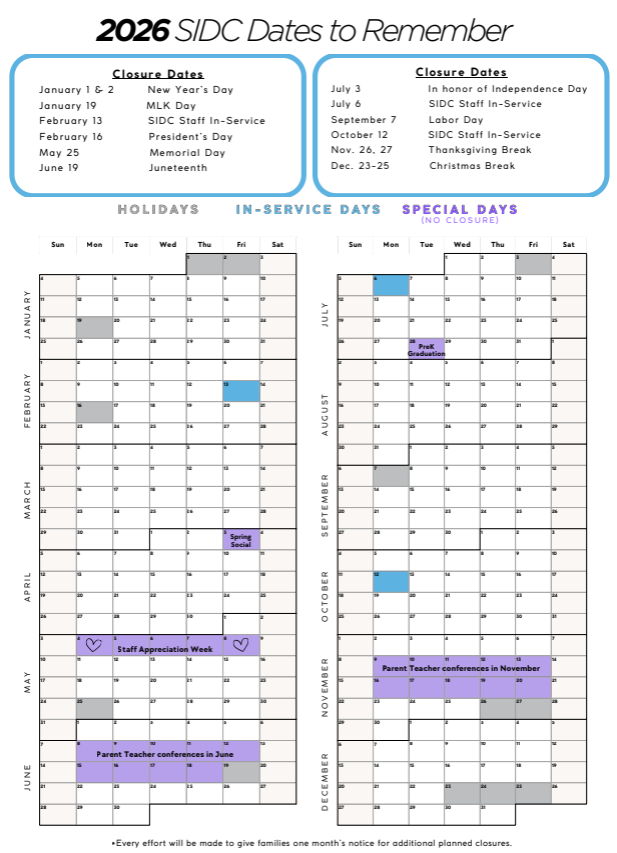 Home Classrooms Infants SmallTods BigTods Preschool Pre-K Curriculum Curriculum Health & Safety About Us About SIDC SIDC Staff Careers Calendar 2026 Calendar FAQs